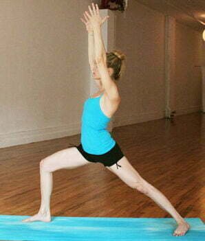 Warrior One: From down dog, step your right foot forward between your hands, spin your left heel down with the foot slightly angled out, press into your feet, and reach your arms to the ceiling, framing your face. Breathe here for five deep breaths and then repeat on the left side.